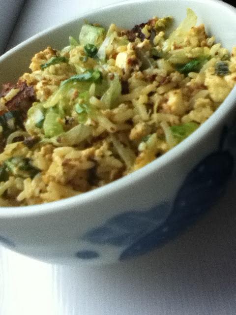 Black salt is something I have heard about on vegan blogs and in Isa Chandra Moskowitz's Vegan Brunch, where it is used to recreate an eggy flavour in tofu omelettes and other normally egg based dishes. Here the tofu is the star of the dish. I deep fry it in large cubes; the outside becomes brown and chewy, like egg white when it is fried in hot oil, and the inside is still soft. I break this up and then incorporate it within the rice towards the end of cooking, for a chewy savoury texture and taste. My mum used to add finely shredded iceberg lettuce to the fried rice, which I have continued to do as it adds a nice sweetness to the dish.
